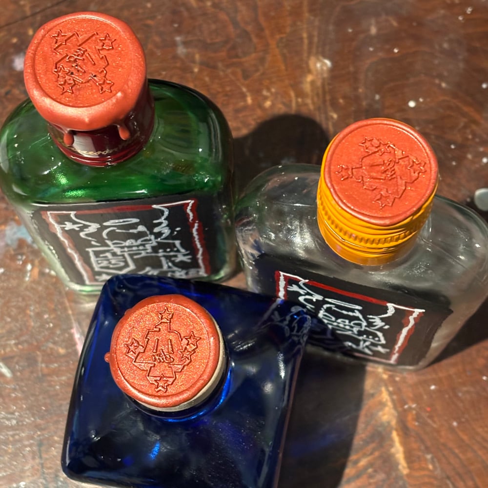 **Found two of the first bottles done by the artist DBM. A "Roller Boss" dated 6/22 (on bottom) and the other 10/23. To keep them original, no updates were made to these bottles. Both are missing the caps and no reflector strips were added to the backs. These throwbacks will come with a vintage stationary moniker and extras to make up for the missing details. Still a good deal. Grab one!