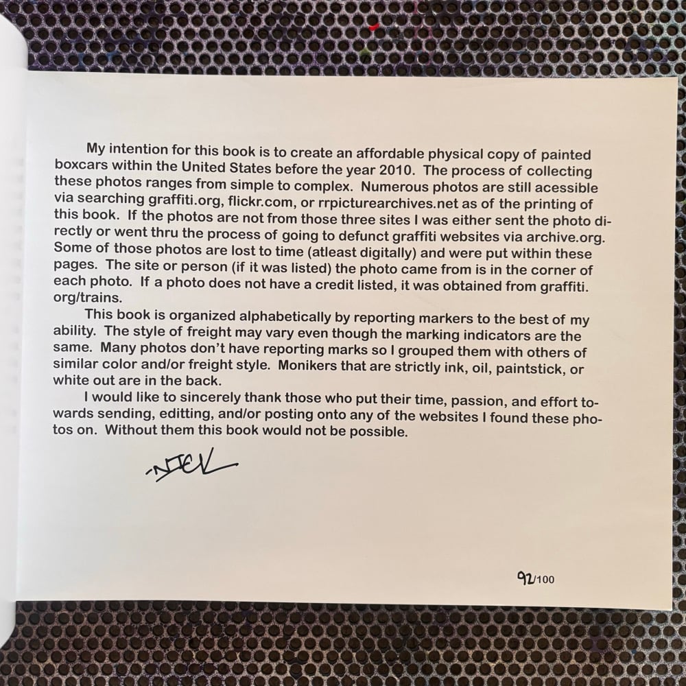 We know what you thinking...This is one of those don't judge a book by it's cover books. This book is certified legit!! Book is printed on solid quality materials with over 300 pages and thousands of color photos of boxcar art pre-2010, before everybody and their mama started painting. Some real gems in there as far as panels and whole cars go. In the very back, there is a moniker section which includes some of biggest heavy hitters in the game. This book is definitely worth getting for the coffee table, and if you don't have a coffee table...You gonna get one cause this book is just that good. What's even better is these joints are signed by the author and numbered. Only a 100 printed, only a few left! Get yours now, extras included.