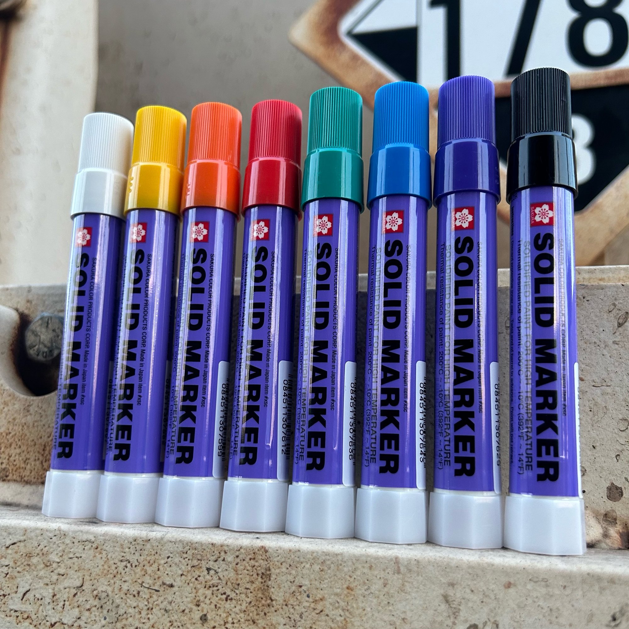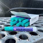 This item right here is a shop favorite and a must have in the toolbox. The Sakura solid marker is a great, all-purpose marking tool! Convenient and easy to use, no need to sharpen or refill, which means no mess. Specially formulated to write on most surfaces and resists fading like nobody's business! Oily, icy, wet, dry, cold surfaces... Doesn't matter. Sakuras are extremely visible, opaque, and permanent! Perfect for monikers, art, and other applications.